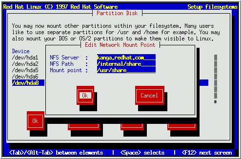 Additionally, Red Hat Linux allows you to mount read-only NFS volumes when your system boots; this allows directory trees to be shared across a network. Choose Add NFS. If you have not selected a network-related installation method, you will be presented with several dialog boxes concerning network configuration (Turn back to Section 3.4.6 for more information). Fill them in appropriately. You will then see a dialog box entitled ``Edit Network Mount Point''. Enter the NFS server's hostname, the path to the NFS volume, and the local mount point for that volume (see Figure 26).