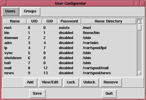 The tool shown in Figure 49 manages the users and groups on your system. In a sense, it is a graphical editor for /etc/passwd and /etc/group, and for