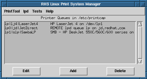 In order to create a new print queue, choose Add. Then, select what type of printer is being added. There are 3 types of print queues which can be configured with printtool: