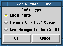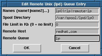 Please Note: If you need to use a username and password for an SMB (LAN Manager) print queue, they are stored unencrypted in a local script and must be passed on the command line to the smbclient program. Thus, it is possible for another person to learn the username and password. It is therefore recommended that the username and password for use of the printer not to be the same as that for a user account on the local Red Hat Linux system, so that the only possible security compromise would be unauthorized use of the printer. If there are file shares from the SMB server, it is recommended that they also use a different password than the one for the print queue.