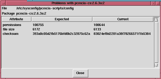 To get more information on the problems found with a file, double click on the file's path. A window like the one shown in figure 77 lists the expected and current values of the attributes that are amiss.