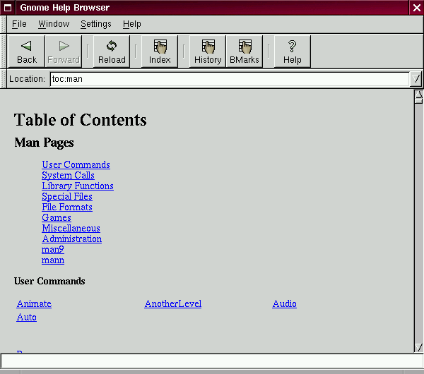 which will start one of the X Window System man page browsers. When the menu appears, click on Manual Page. From here, you'll have a number of options from which to find a man page: You can alphabetically display all the man pages on your system; search for them by command or by the section in which they appear.