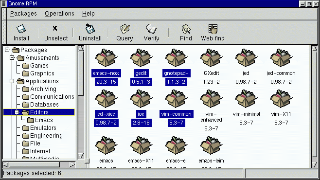 Each folder icon in the tree view at left represents a group of packages. Each group can contain subgroups. Groups are used to place packages that perform similar functions in similar locations. For example, the folder Editors contains text editors such as ed, vim and GXedit. From the tree view on the left, you might find another folder beneath Editors called Emacs, which would contain both emacs and emacs-X11.