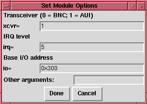 If there is more than one module which can be used for the module type you have chosen, you will be presented with a dialog box (Figure 3-38) which asks which module you want to use, and may also ask for specifics about the type of module; for ethernet, for example, you need to choose from eth0, eth1, etc. When you are done, click Ok again to continue to specify any module options in the next dialog box (Figure 3-38), which is the same as the dialog for editing a module.