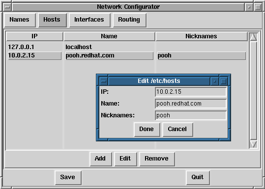In the Hosts management panel you have the ability to add, edit, or remove hosts from the /etc/hosts file. Adding or editing an entry involves identical actions. An edit dialog box will appear, simply type the new information and click Done when you are finished. See Figure 3-40 for an example.