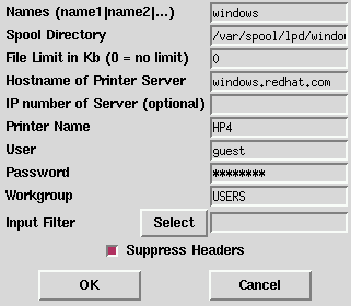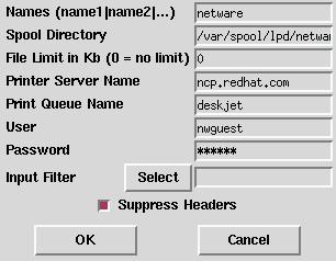 Please Note: If you require a username and password for an SMB (LAN Manager) or NCP (NetWare) print queue, they are stored unencrypted in a local script. Thus, it is possible for another person to learn the username and password. It is therefore recommended that the username and password for use of the printer to be different than that for a user account on the local Red Hat Linux system, so that the only possible security compromise would be unauthorized use of the printer. If there are file shares from the SMB server, it is recommended that they also use a different password than the one for the print queue.